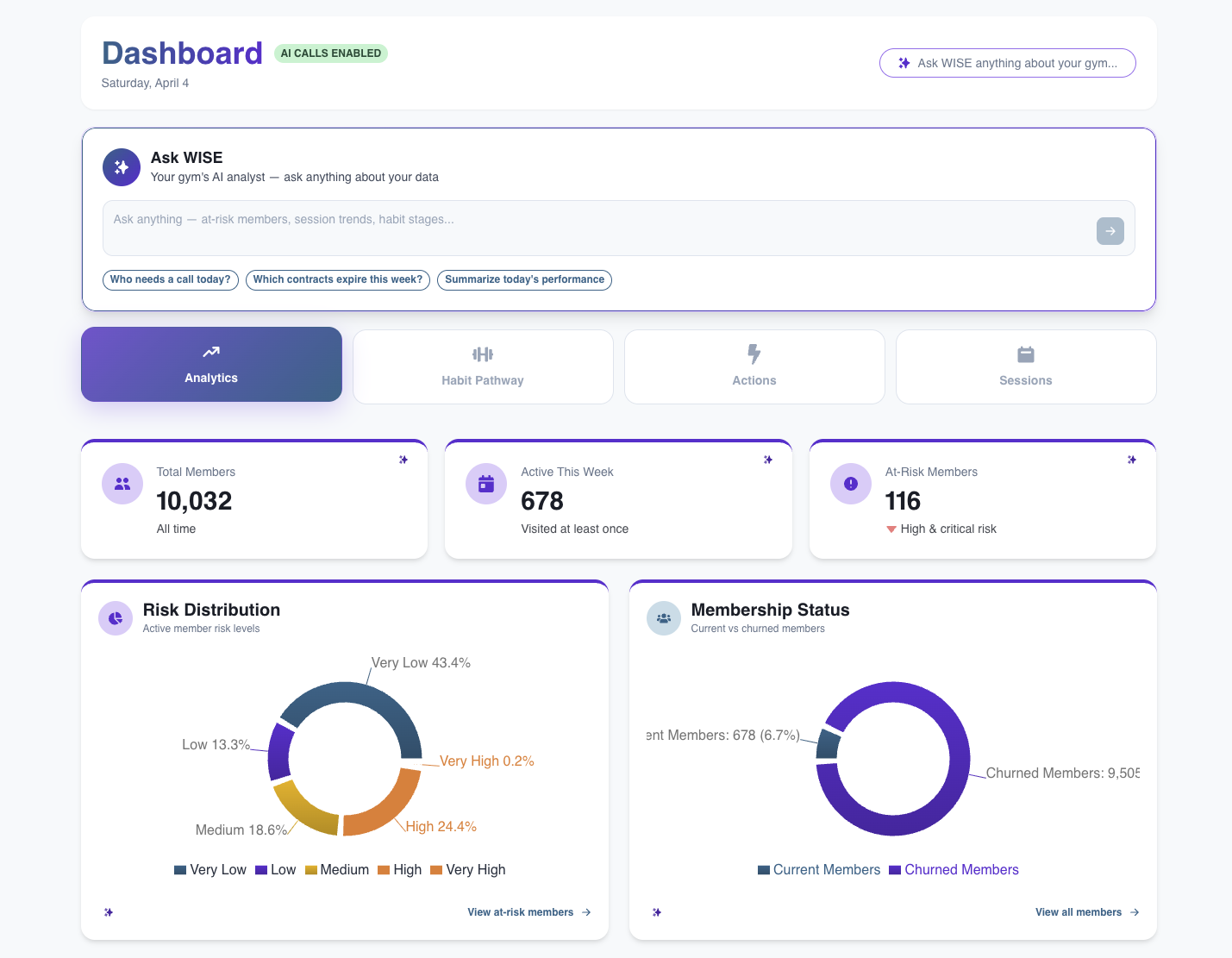 gymwise.ai is a behavioral and operational AI platform that monitors, acts, and answers. It follows every member's fitness habit formation, intervenes at the right moment, and brings full operational intelligence to your gym.